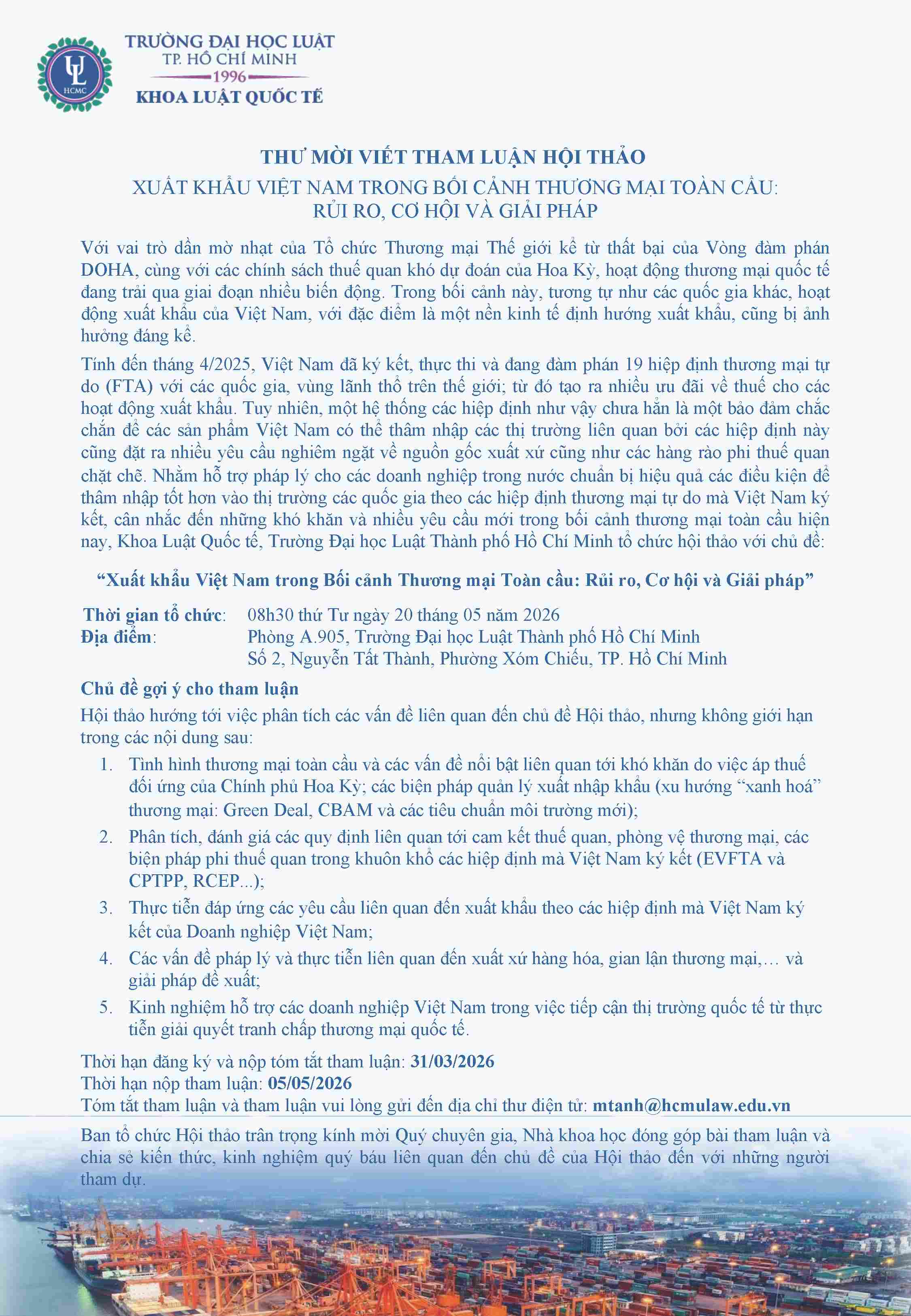 Với mong muốn tạo diễn đàn trao đổi học thuật và thực tiễn, Khoa Luật Quốc tế – Trường Đại học Luật TP. Hồ Chí Minh trân trọng tổ chức hội thảo: